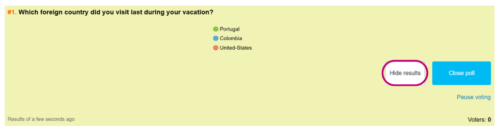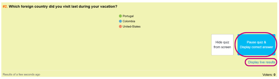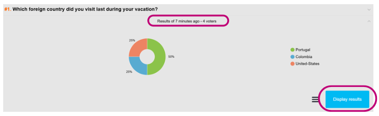 The results will be displayed after the survey is closed. If you want to display the results, you must either click on Pause quiz & Display the correct answer or on Display live results.